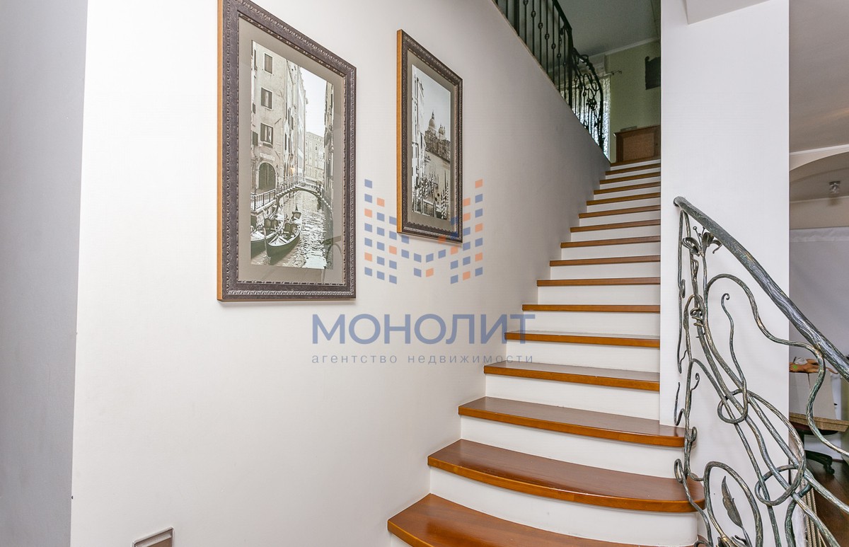 -прихожая и широкий открытый коридор. В коридоре удобная лестница на второй этаж, изготовленная по индивидуальному заказу, ступеньки выполнены из красного дерева, перила кованые ручной работы.