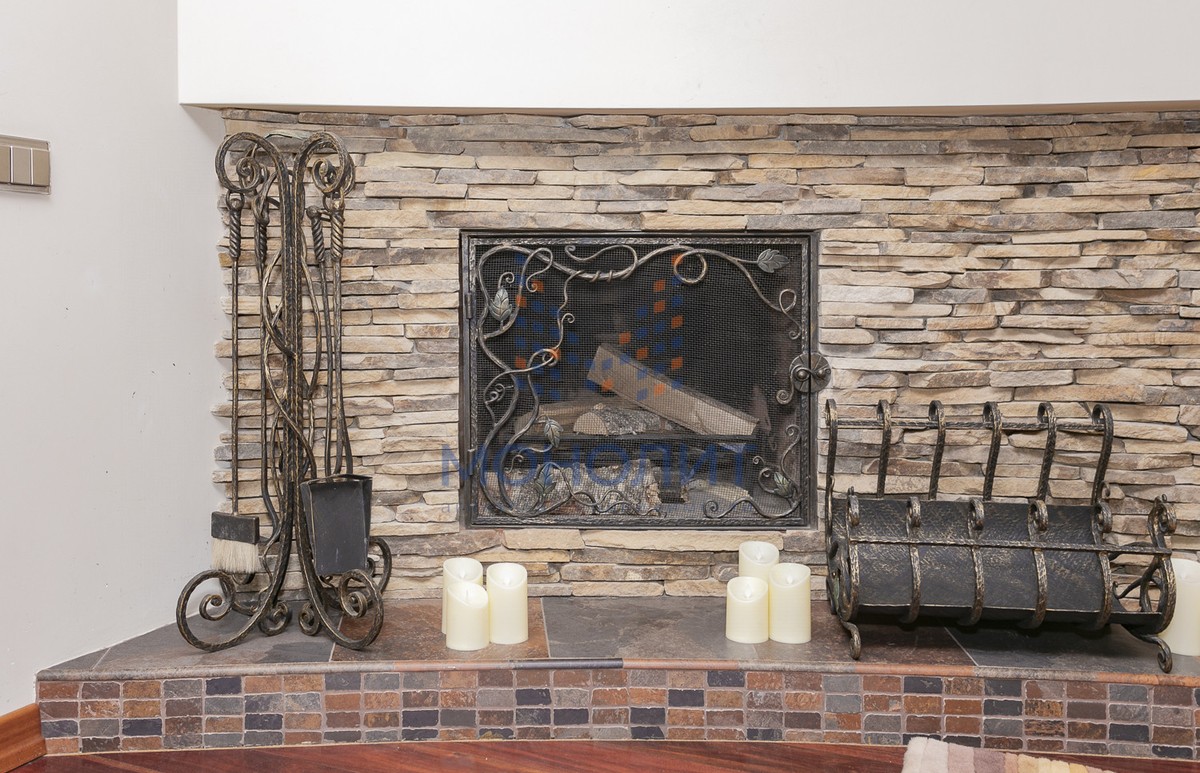 Настоящий камин, отделанный натуральным камнем.