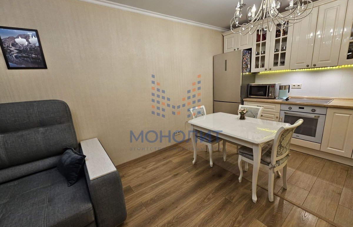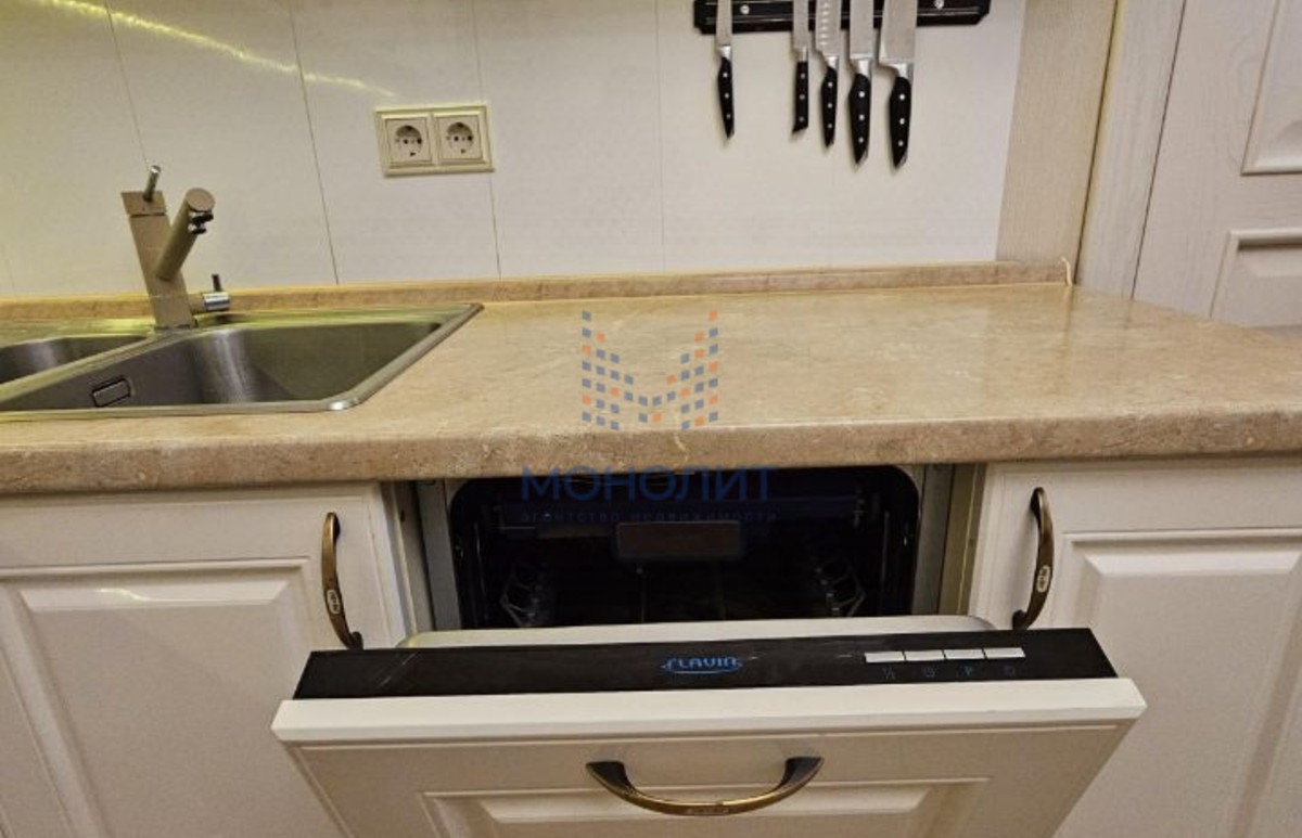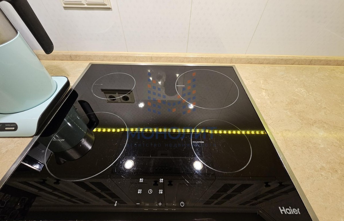 - Качественная отделка и техника: европейская электрика и сантехника, дорогая лакированная кухня. Новому владельцу остаётся вся крупная бытовая техника (плита с индукцией, посудомоечная машина и др.), кроме диванов.