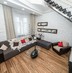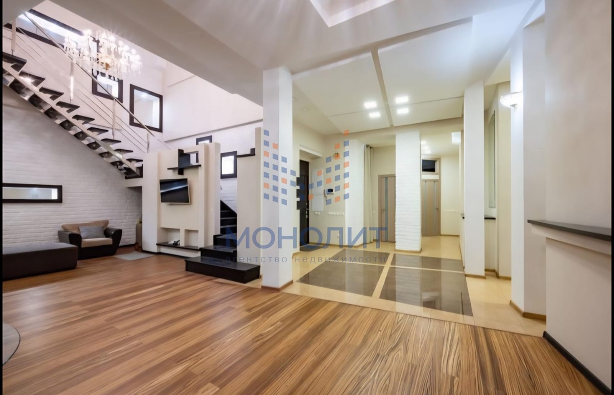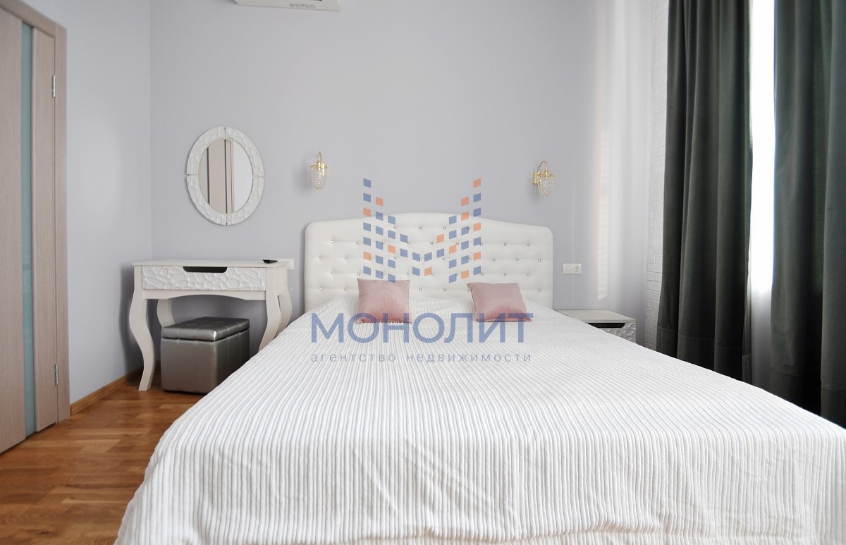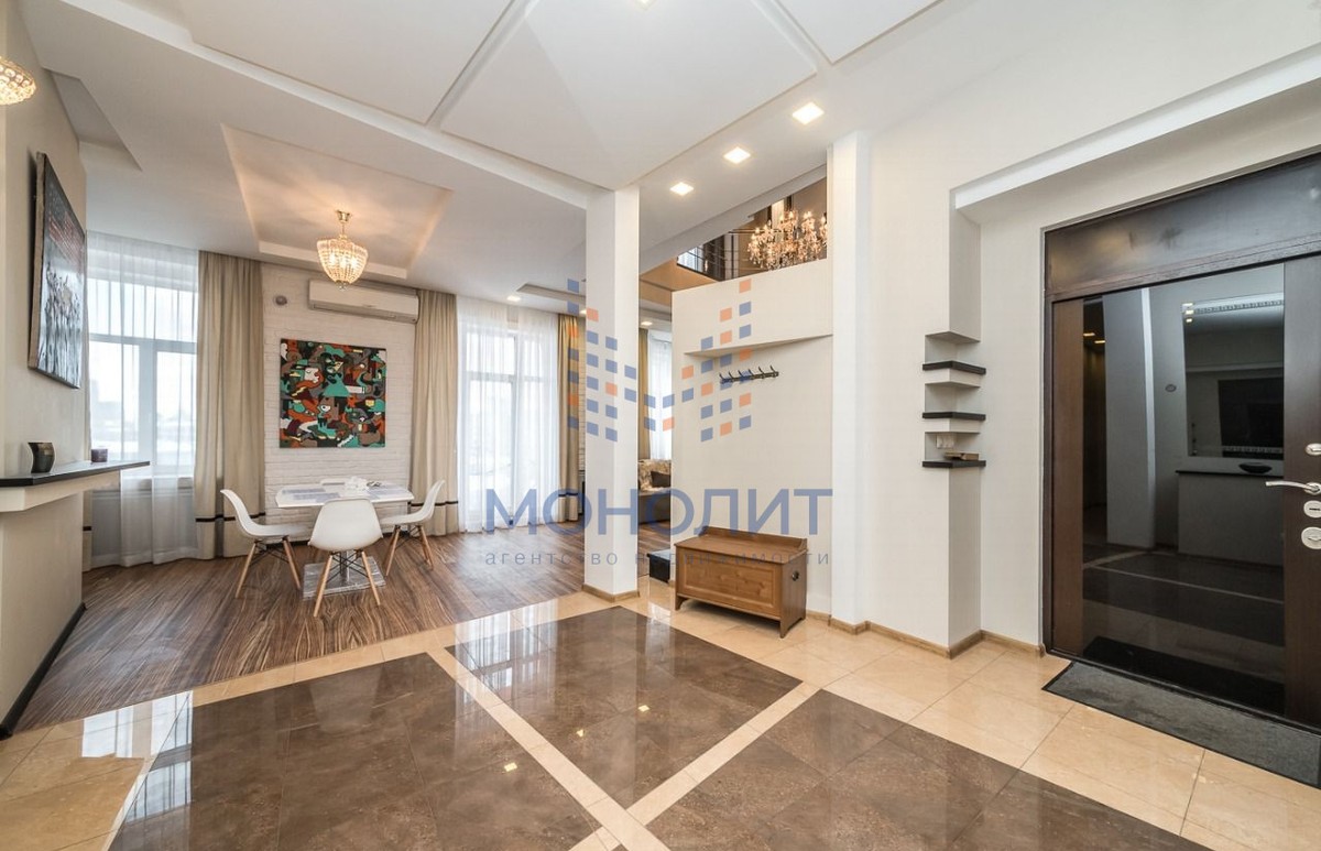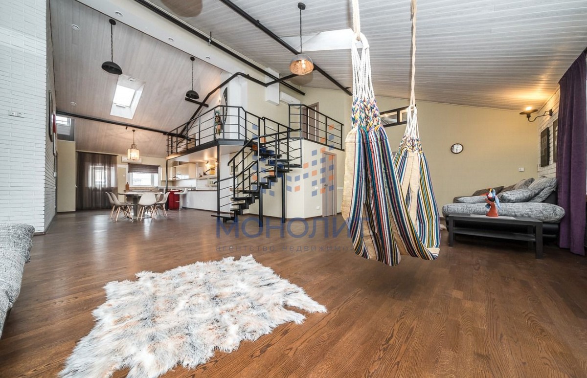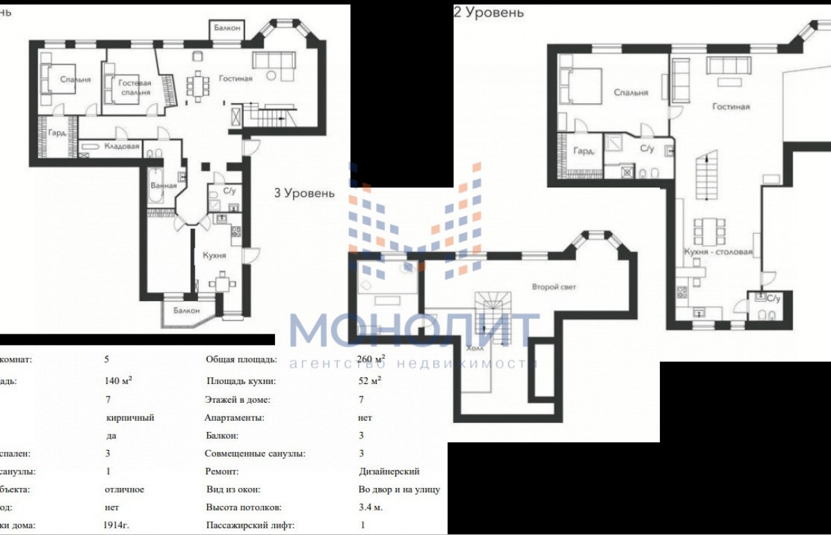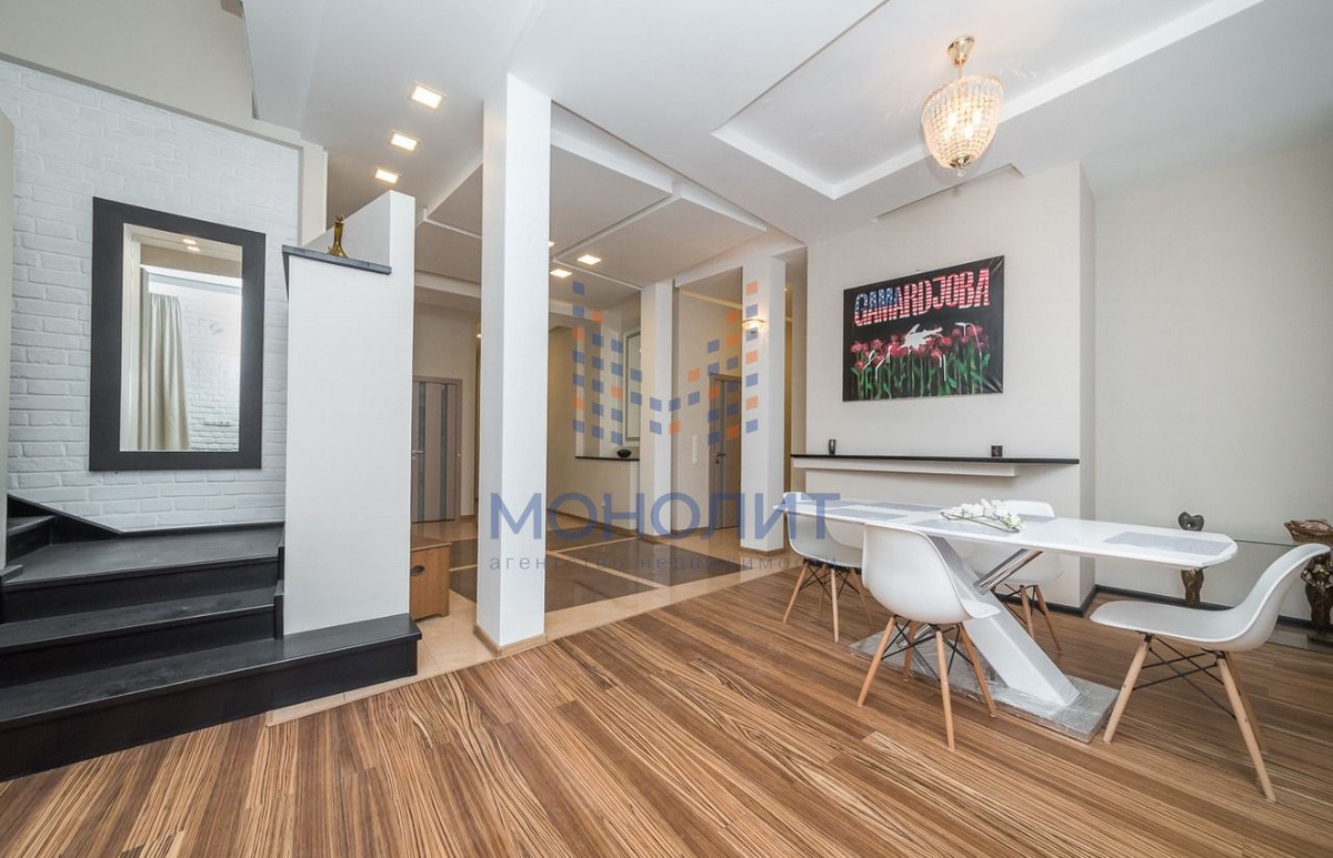 1-й уровень: просторная кухня с выделенной обеденной зоной, гостиная, две спальных комнаты, 2 санузла, гардеробная, три балкона.