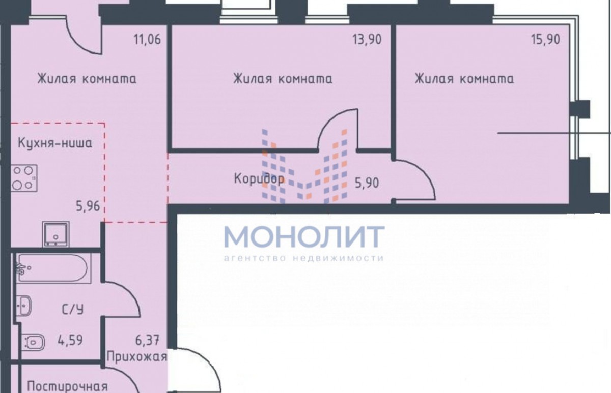 - ЭРГОНОМИЧНАЯ ПЛАНИРОВКА: кухня‑ниша 5,96 м², жилая зона 40,86 м², прихожая 6,37 м², коридор 5,90 м², санузел 4,59 м², постирочная 2,72 м², балкон 2,35 м²;