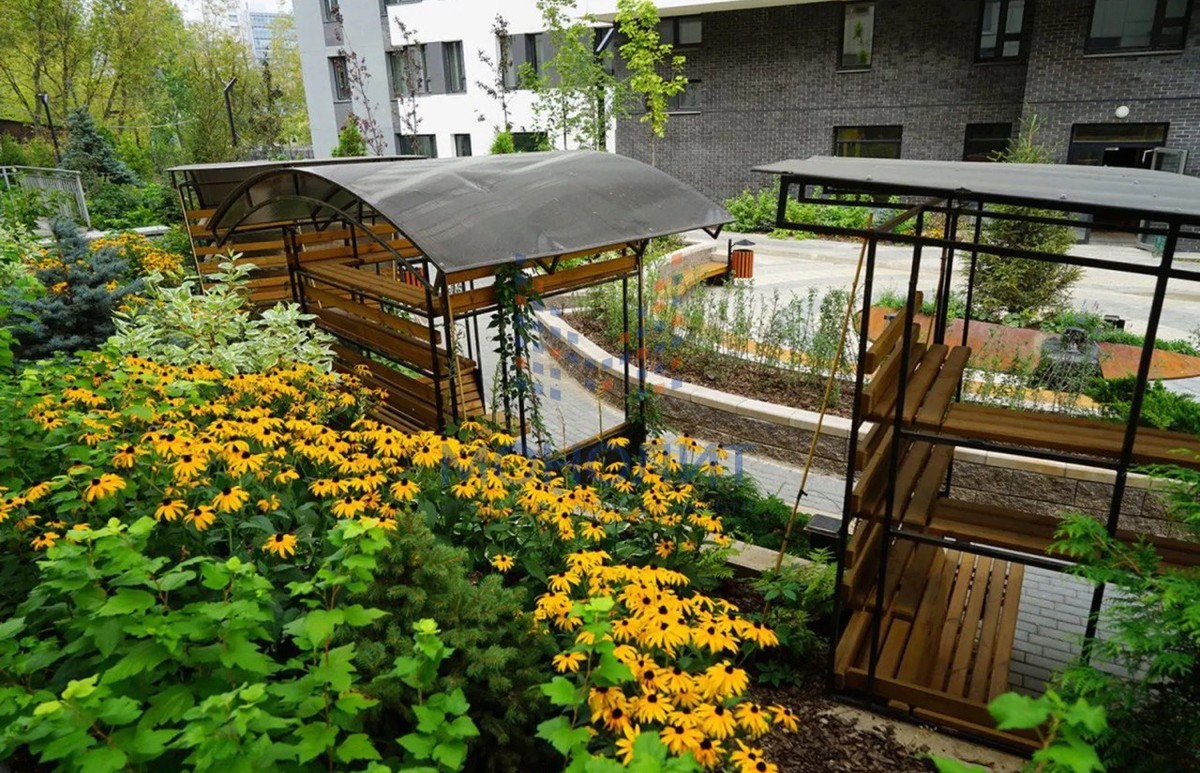 Во дворе детские площадки, спортивная площадка, зоны для отдыха и беседки.