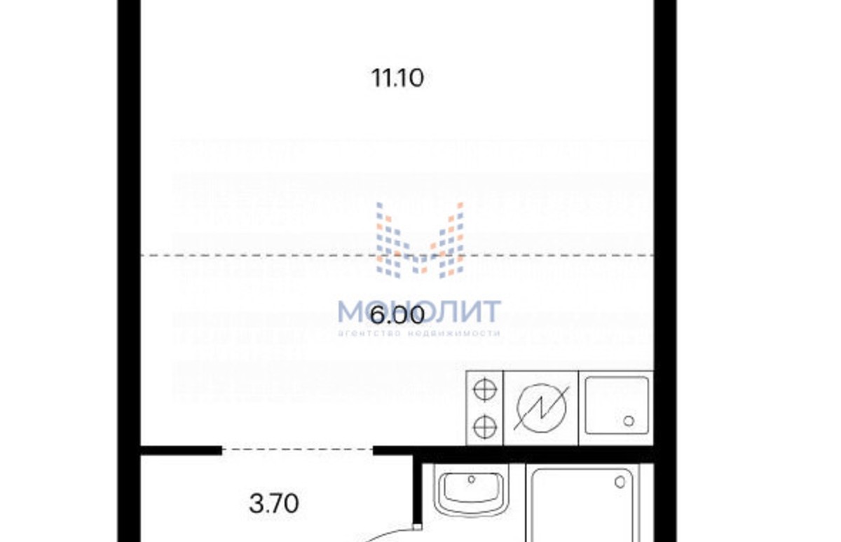 - студия 23.3 м² (жилая 11.1 м², кухня 6 м²)
