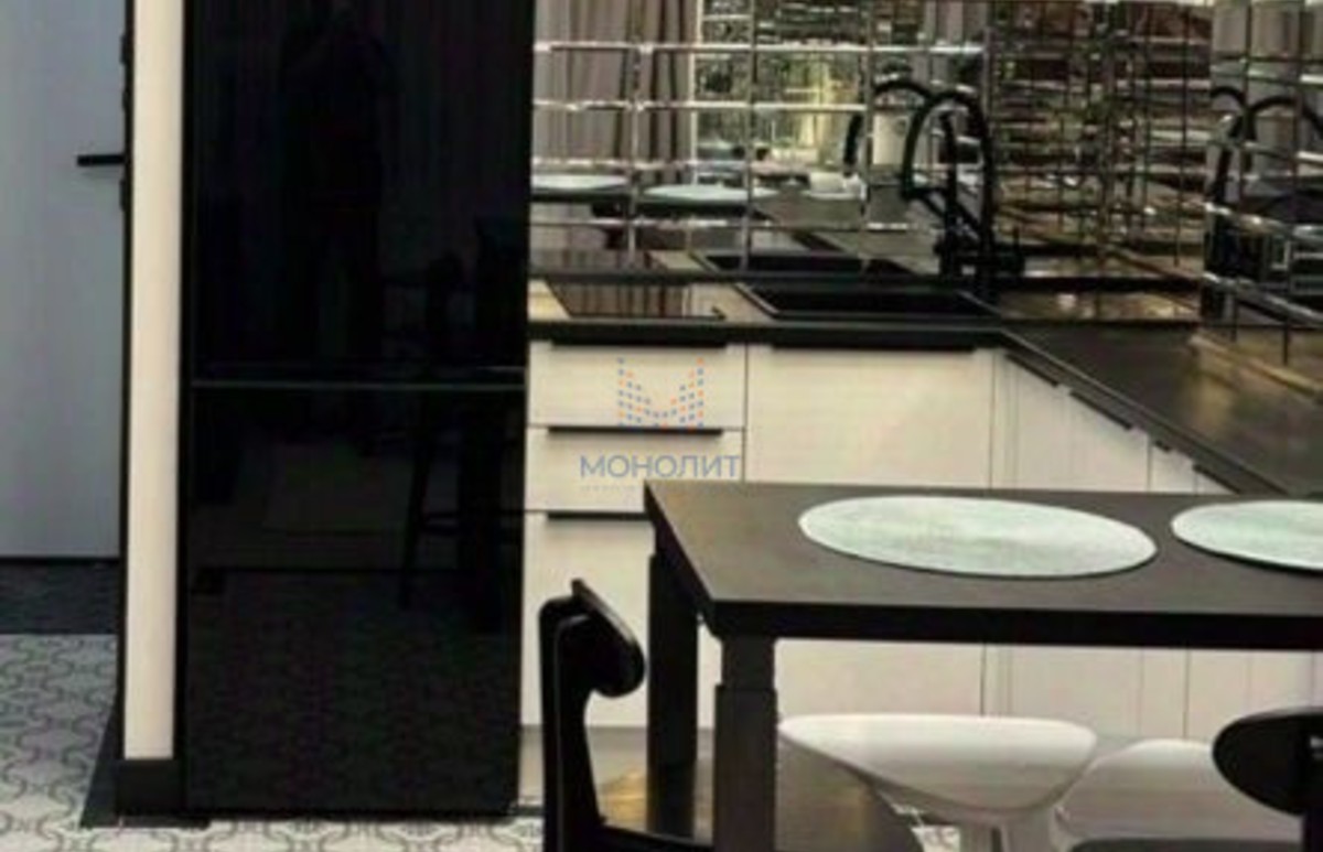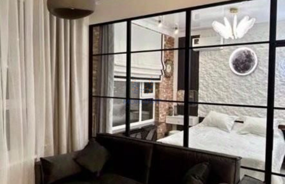 В квартире сделана стеклянная перегородка и за счет ее,расширена зона гостинной и кухней