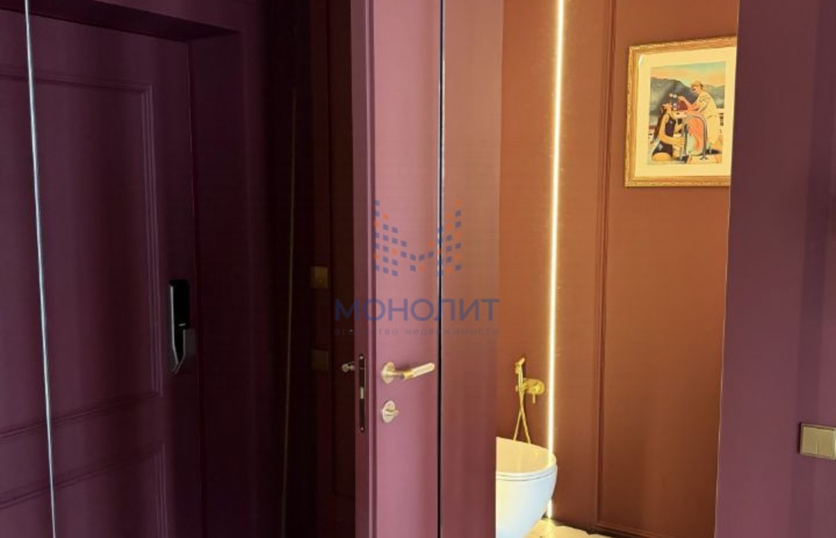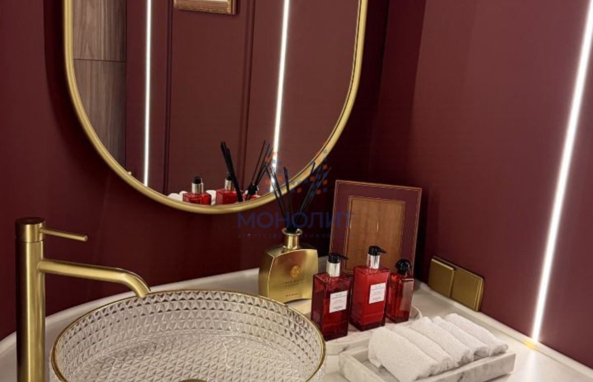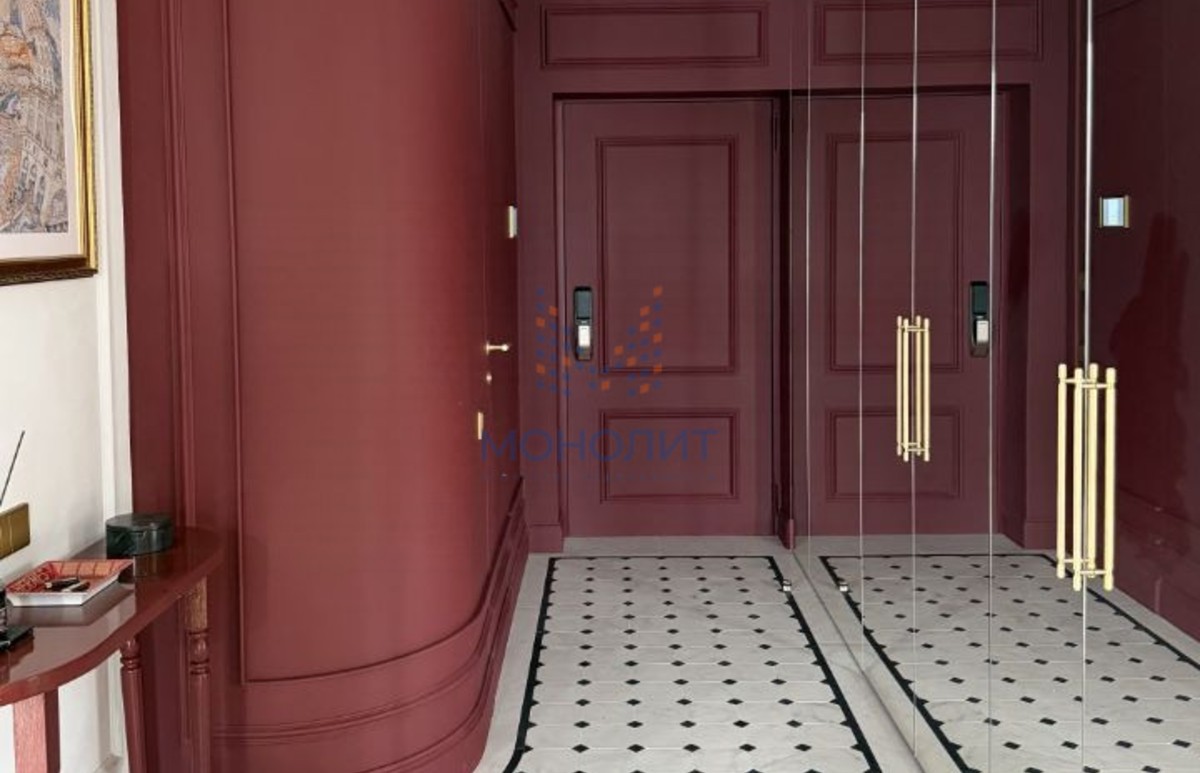 • Умный дом: шторы и освещение интегрированы и управляются через Алису Интерьер и атмосфера Холл Французская плитка, правильный винный оттенок стен, крупный зеркальный шкаф, выполненный на заказ в бордовом цвете.