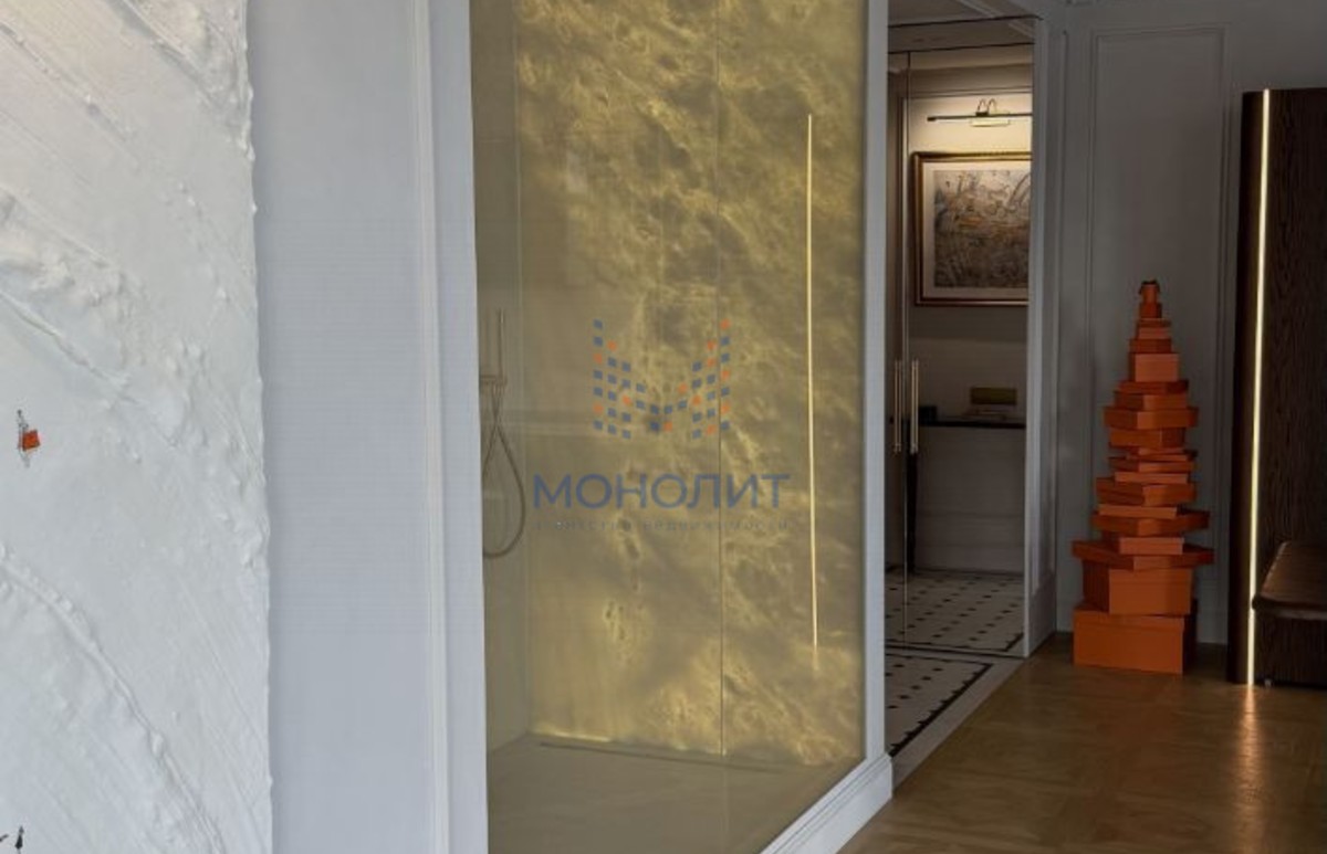 Просторная душевая с умным стеклом, которое по желанию становится прозрачным. Мраморная стена душевой подсвечивается перекликаясь с фартуком кухни, создавая единый дизайнерский ритм по всей квартире.