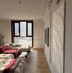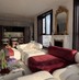 - Гостиная зона: • кушетка на ковре из натуральной овчины; • Диванная группа с культовым диваном в молочном оттенке и кастомным бордовым модулем;