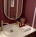 Гостевой санузел Продолжение концепции холла: бордовый цвет, с добавлением дерева и камня.
