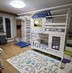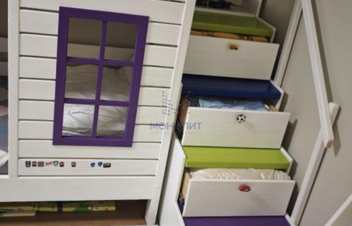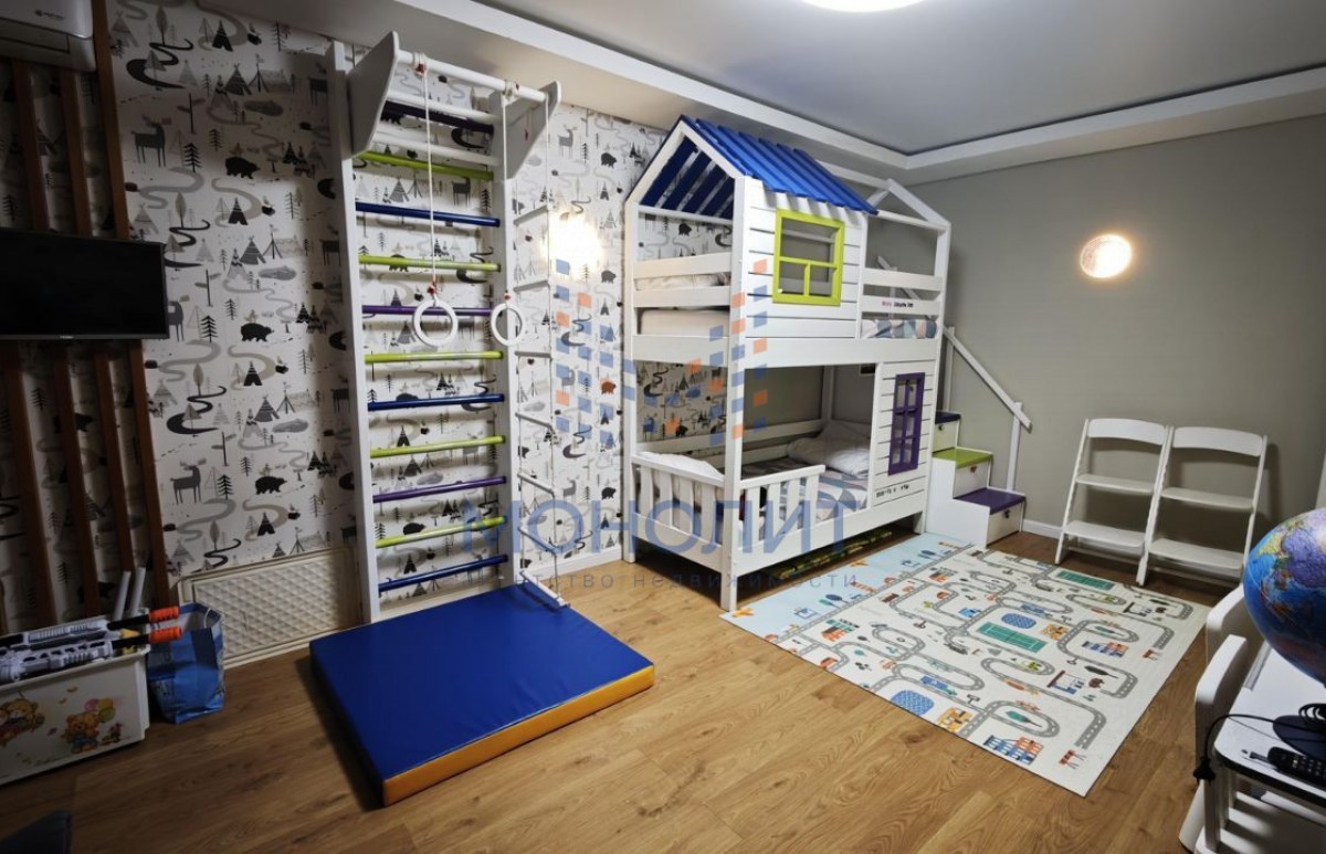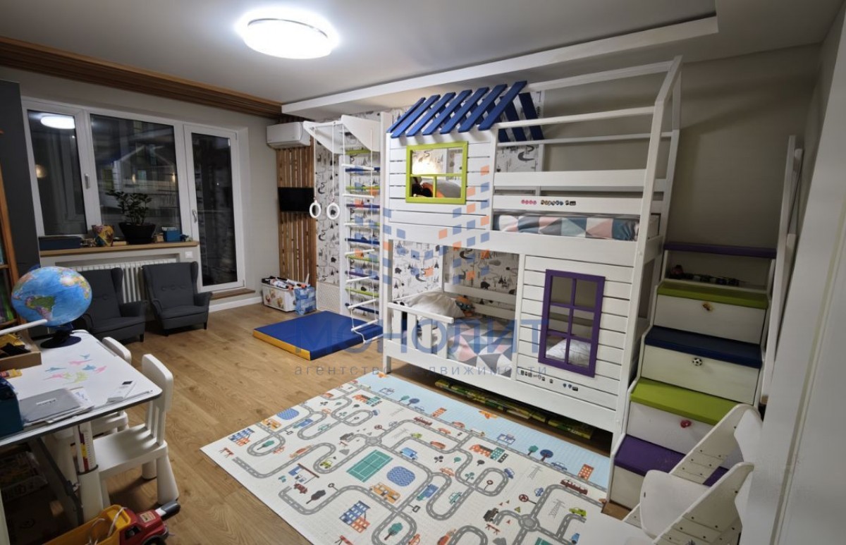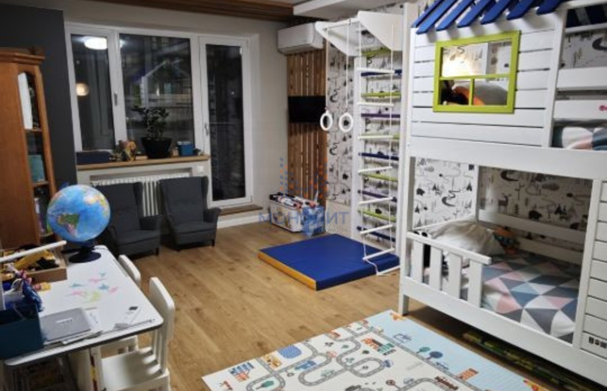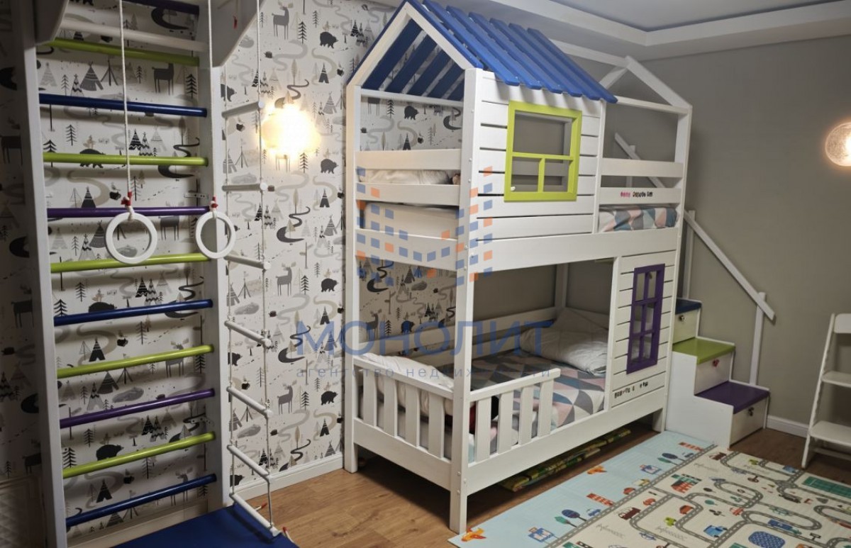 Отдельного внимания заслуживает детская комната — мебель выполнена вручную из массива лиственницы, установлены ортопедические матрасы, пространство продумано для здорового и комфортного отдыха ребёнка.