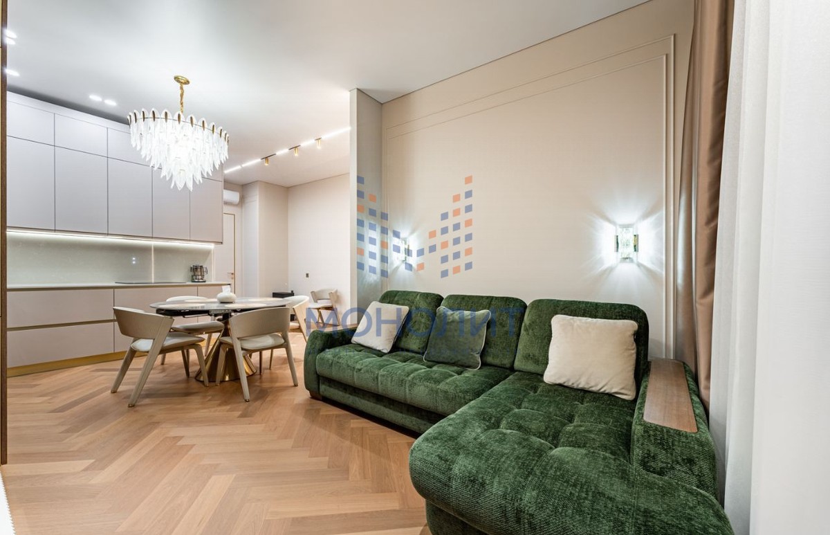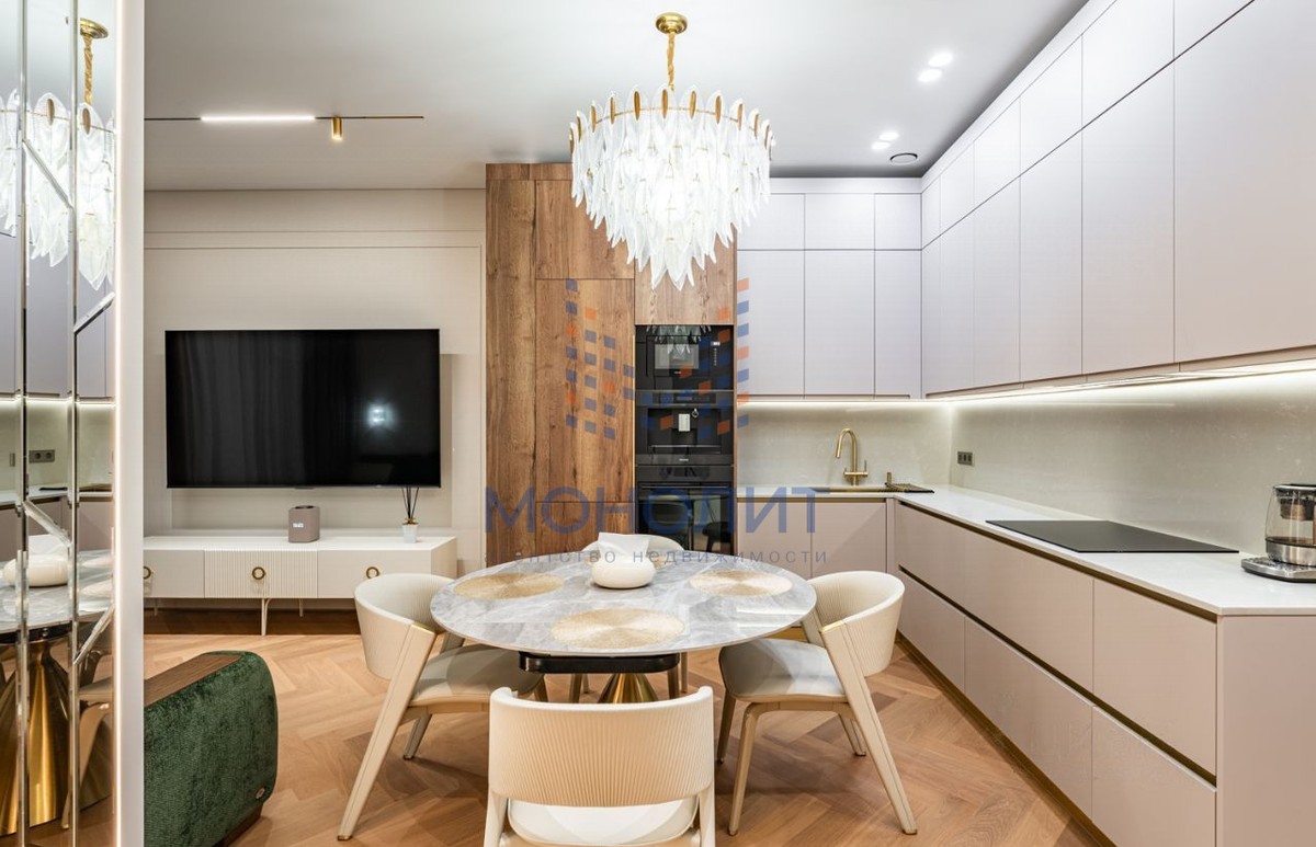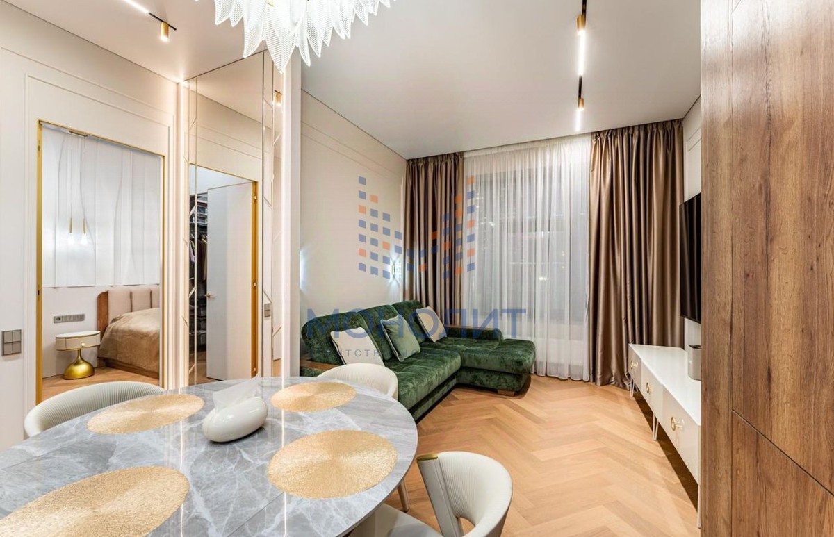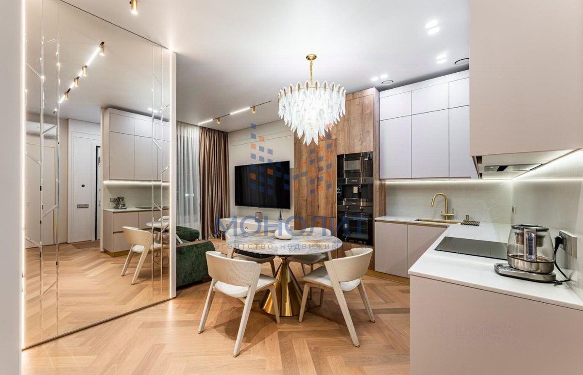 - Просторная кухня-гостиная для уютных вечеров и камерная спальня с гардеробной зоной. Выполнен свежий дизайнерский ремонт в стиле «тихая роскошь» — нейтральные тона, премиальные материалы. Высокие потолки 3.15 м и окна в пол наполняют пространство светом. Общая площадь 57.3 кв.м.