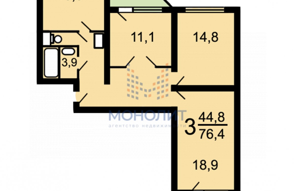 - Количество комнат: 3 комнаты площадью 18.9 ,14,8 и 11.1 кв.м каждая