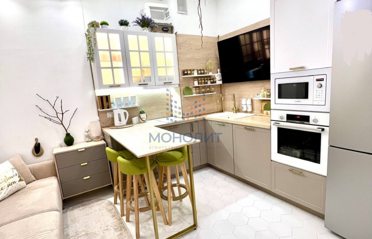 *Кухня (10 м2), где есть всё для кулинарных шедевров и семейных вечеров: стильная техника Bosch и Haier (духовой шкаф, микроволновка, варочная поверхность, посудомойка, сушильная машина), барный стол и уютный диван для домашнего кинотеатра.