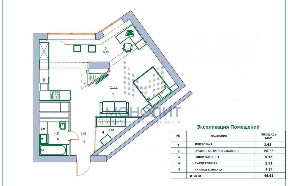 Студия, 45.6 м² - Объект 133745519