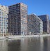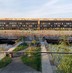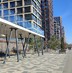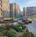 закрытый двор на стилобате с мостиками между домами и шезлонгами с видом на воду — место для отдыха и релаксации прямо в комплексе;
