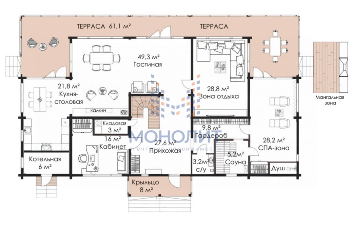- SPA-зона с сауной, лаунж-зоной и выходом на террасу— ваша личная территория восстановления и релакса;