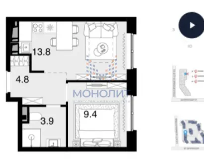 1-комнатная квартира 42 м² 3/30 эт.