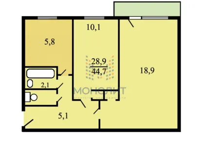 Квартира общей площадью 44,4 кв.м. имее...