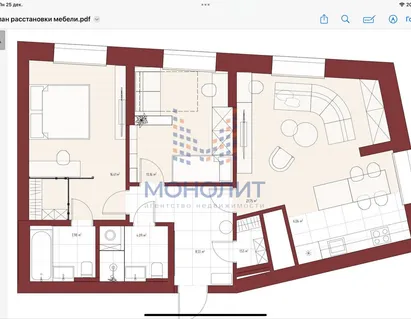 Кухня - гостинная с выходом на утепленную лоджию, просторная спальная и кабинет (при желании детская) с лоджией.