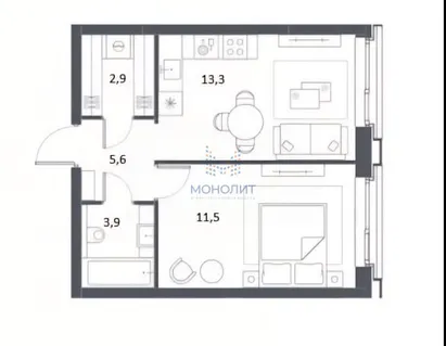 1-комнатная квартира 37 м² 6/26 эт.